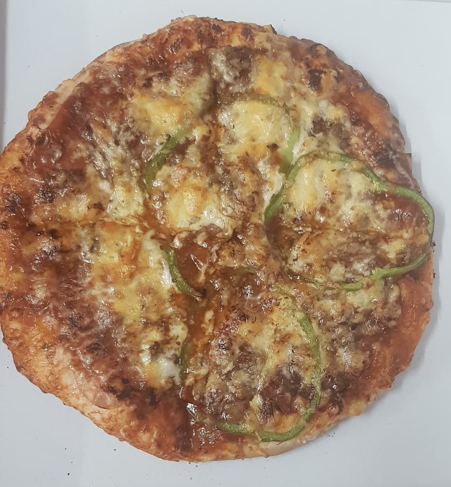 Tomate, queso, orégano, pepperoni, jamón york, ternera, pimiento verde, salsa barbacoa